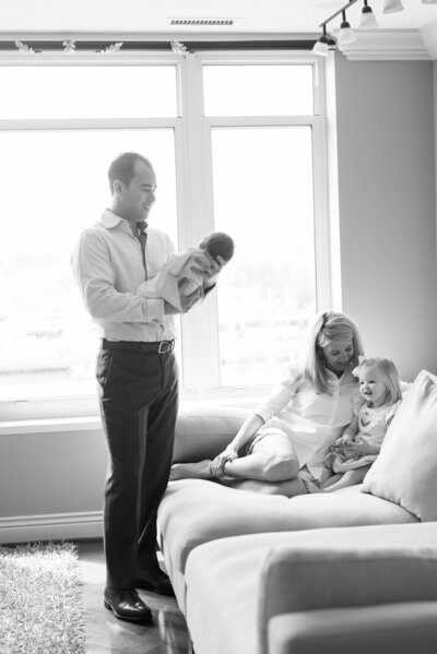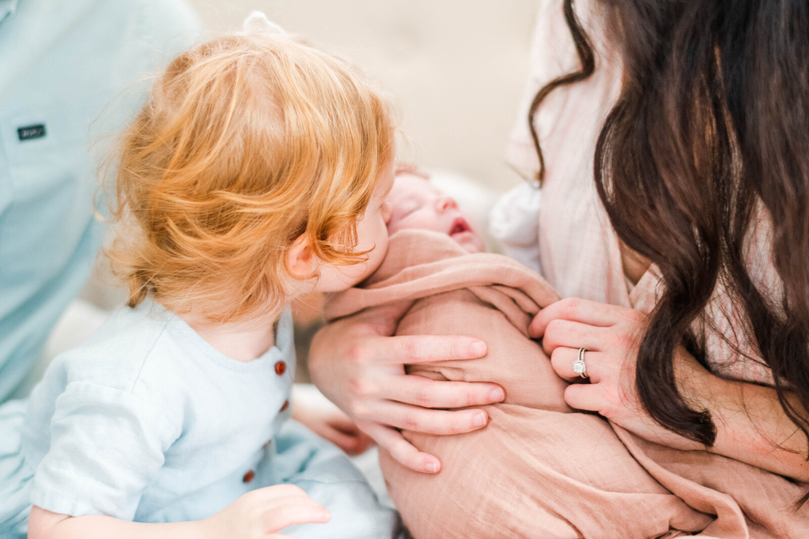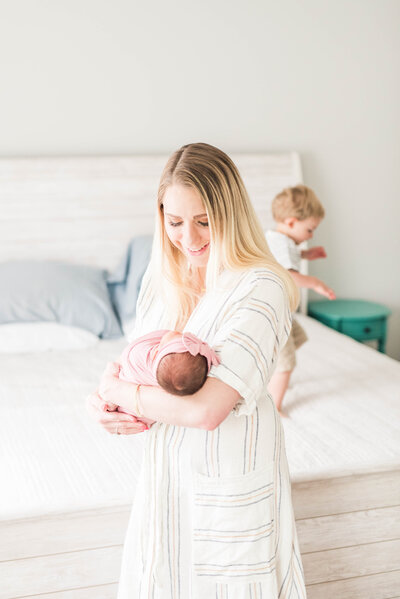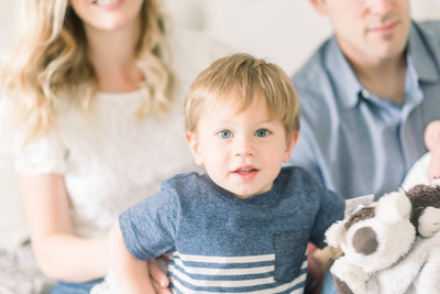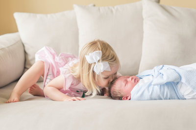 Pets and older siblings are absolutely welcome during your session. This is a huge benefit of having an in-home lifestyle session in the first place! Being in their own environment leads to a better experience for older siblings. They'll feel more secure and can wander in and out of the shoot as they'd like.